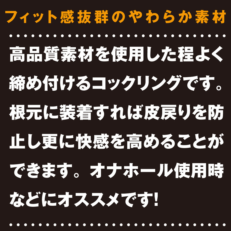 どなたでもフィットする伸縮性の高い柔らか素材を採用!刺激を求めるパートナーとのスパイスとしてはもちろん、ホールオオナニーにも最適!しっかり締めつけながら、ロングプレイをサポートしてくれるコックリングセットです。