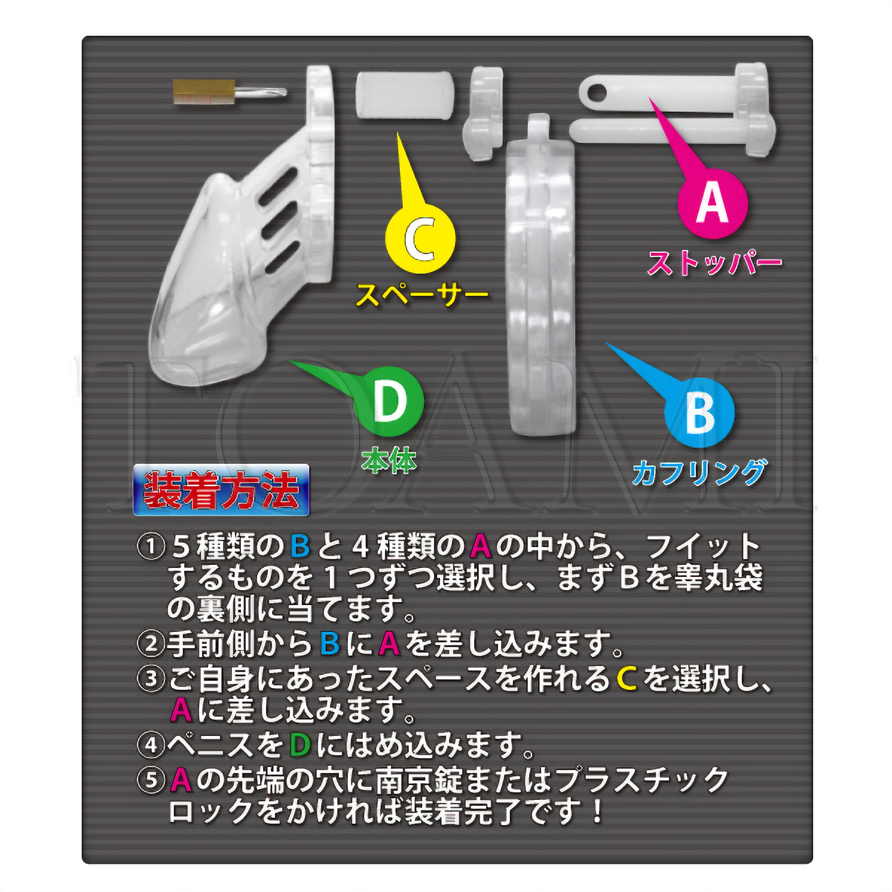 さらに拘束感を味わいたい方に!人気のプラスティック貞操帯「CB-6000」にショートバージョンが登場!「CB-6000」よりも局部の全長が約2cm短くなり、さらに強い拘束感を味わえるようになりました。 大きさの異なるカフリングとピンが付属していますので、フィット感の調節も可能です!また装着したまま排泄もできるので、装着後に付属の南京錠、またはプラスティックロックで鍵をかければ、日常的に拘束&勃起制限を行えます。 こちらはSMボンテージ風のブラックカラー。