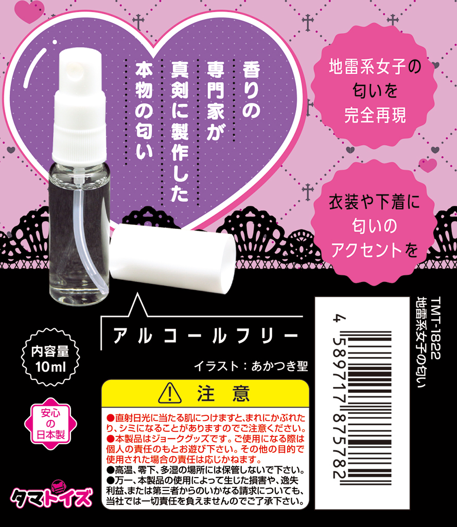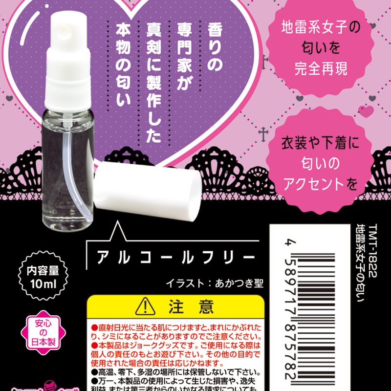 地雷系女子特有のあの匂いを完全再現した匂いフェチグッズが登場♪甘すぎないのに個性的で危うさ漂う、魅惑の香りを忠実に再現!香りの専門家が本気で製作した本物志向のアイテムです♪シュッと手軽に使えるアトマイザータイプで、抱き枕やラブドール、オナホールにふりかければリアル感がさらにアップ!衣装や下着に吹きかけて、匂いのアクセントにもおすすめです♪地雷系女子のそばにいるような新感覚の香り体験をぜひお楽しみください!内容量は使いやすい10mlサイズで、アルコールフリーなのも安心♪あの時感じた、忘れられないあの匂いをもう一度お楽しみください!●TMT-1822